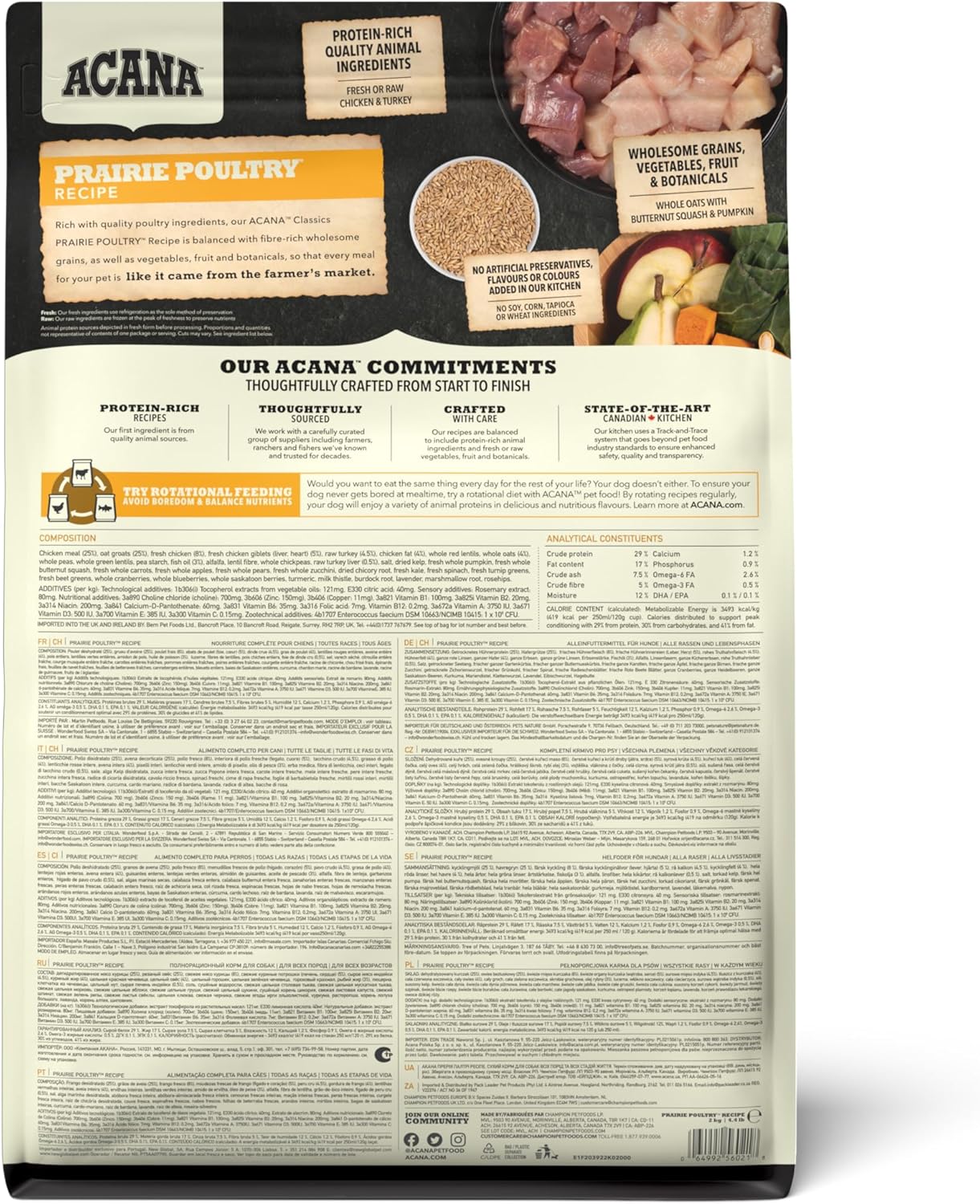 Con pollo, pavo de corral y huevos frescos de corral, ACANA Prairie Poultry está cargado de ingredientes de primera calidad para proporcionar todos los nutrientes que los perros necesitan de la forma más natural. Contiene un 50% de ingredientes animales como fuente de proteínas de primera calidad y 1/3 de ellos son frescos o crudos, conservando así todas sus propiedades nutricionales.