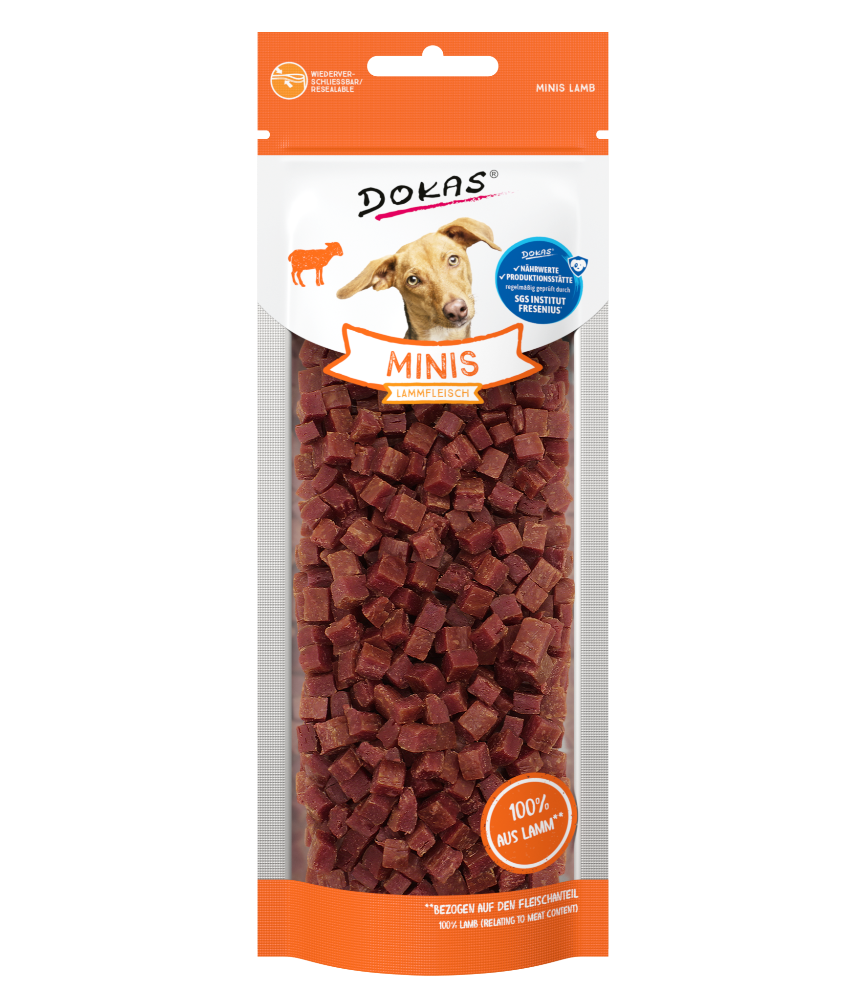 Los Minis estan elaborados 100% con carne de cordero (en la porción de carne). Las piezas pequeñas son ideales para usar durante el entrenamiento, pero también son ideales para llevar. Además, la L-carnitina que contiene puede favorecer activamente la quema de grasas. Libres de soja, gluten, cereales y sin azúcar añadido. ¡La motivación perfecta para cada sesión de entrenamiento! A ofrecer como recompensa entre comidas habituales.