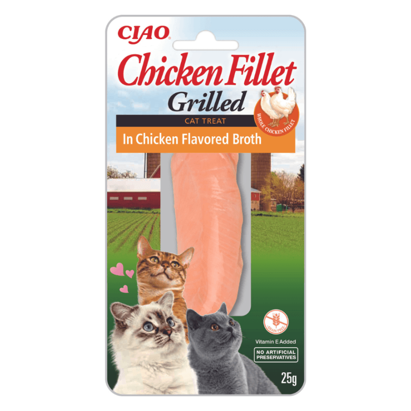 Snacks naturales bajos en calorías para gatos, elaborados sin cereales, conservantes ni colorantes artificiales. Hechos a partir de porciones de pollo criado de forma responsable en granjas, cortado a mano. Los filetes se asan a la parrilla y se envasan en un delicioso caldo de mariscos, proporcionando un alto contenido de humedad que los felinos necesitan para su salud. Además, se envasan al vacío para mantener su frescura y sabor por más tiempo.