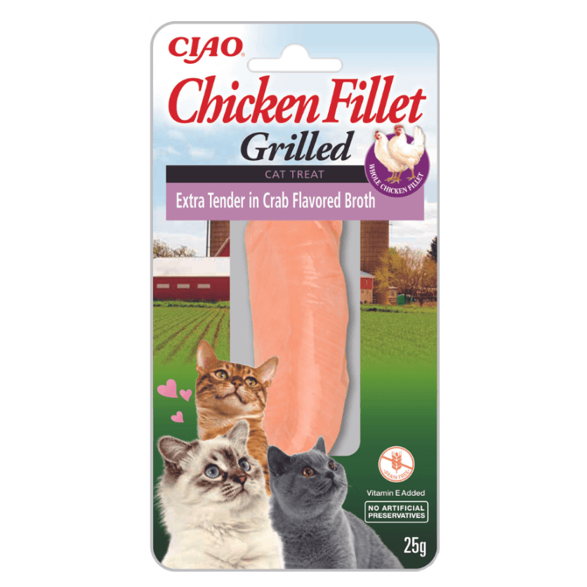 Snacks naturales bajos en calorías para gatos, elaborados sin cereales, conservantes ni colorantes artificiales. Hechos a partir de porciones de pollo criado de forma responsable en granjas, cortado a mano. Los filetes se asan a la parrilla y se envasan en un delicioso caldo de mariscos, proporcionando un alto contenido de humedad que los felinos necesitan para su salud. Además, se envasan al vacío para mantener su frescura y sabor por más tiempo.