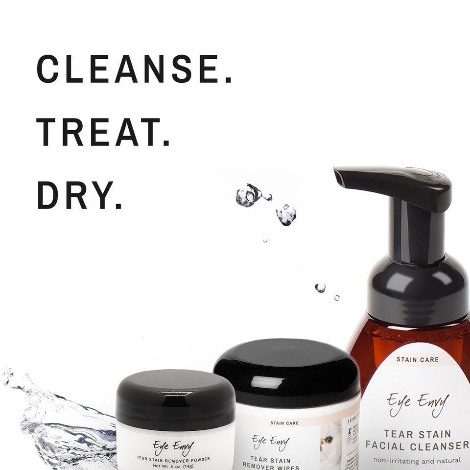 El Kit de Inicio Eye Envy® Tear Stain Remover te ayuda a eliminar las manchas de lágrimas de tu gato de manera segura y natural en solo 7 días, sin antibióticos ni productos agresivos.