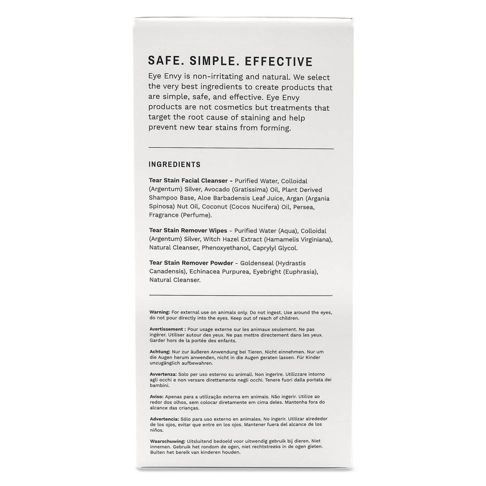 El Kit de Inicio Eye Envy® Tear Stain Remover es el mejor aliado para mantener los ojos de tu perro limpios y libres de manchas en solo 7 días, sin antibióticos ni productos agresivos. Su sistema de 3 pasos elimina eficazmente las manchas y previene su reaparición.