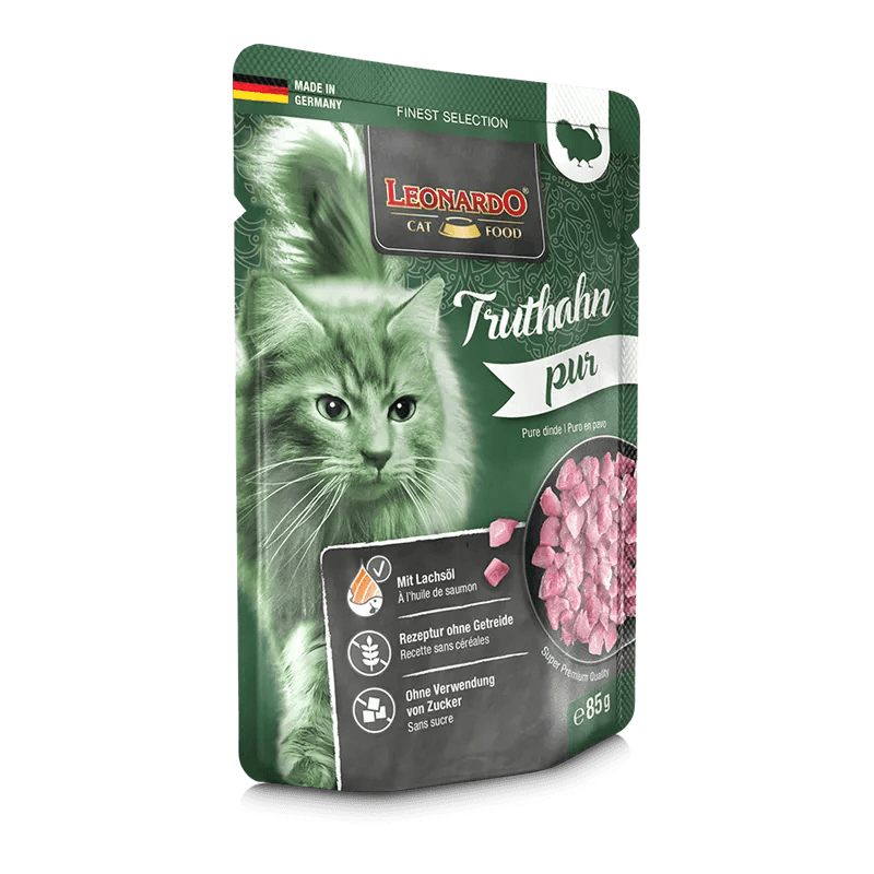 Leonardo Puro en Pavo es un alimento húmedo premium diseñado para satisfacer las necesidades nutricionales de tu gato, reflejando su naturaleza carnívora innata.