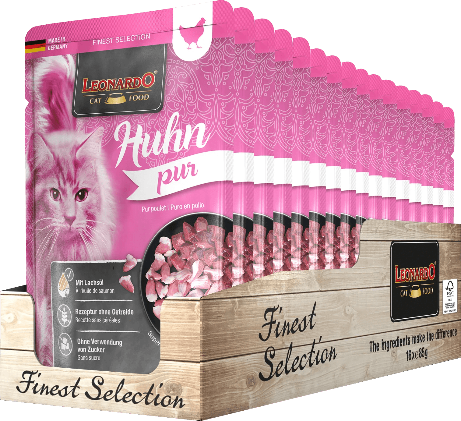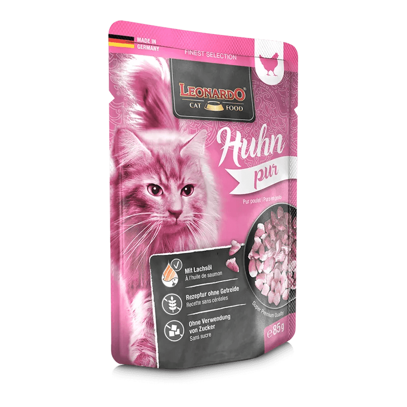 Leonardo Puro en Pollo - Finest Selection es una comida húmeda de alta calidad que celebra la esencia pura del pollo, cuidadosamente elaborada para satisfacer las necesidades nutricionales de tu gato.