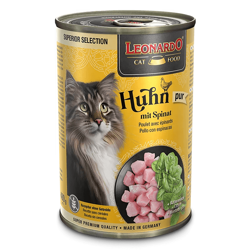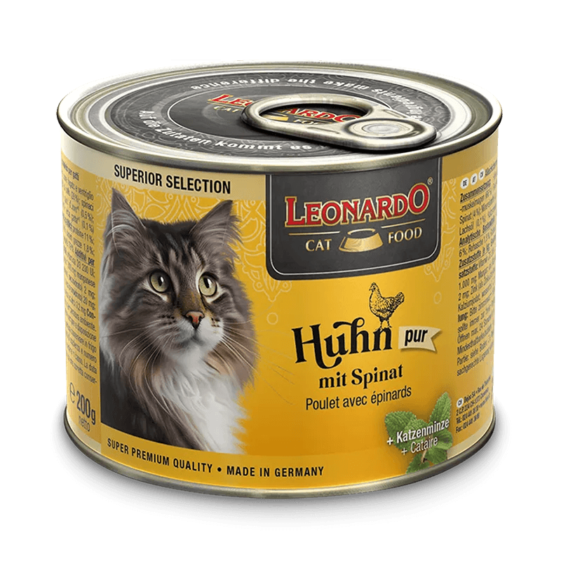 Ofrece a tu gato una experiencia culinaria deliciosa y nutritiva con Leonardo Selection Pollo con Espinacas. ¡Un plato que hará de cada comida un momento especial lleno de sabor y salud!
