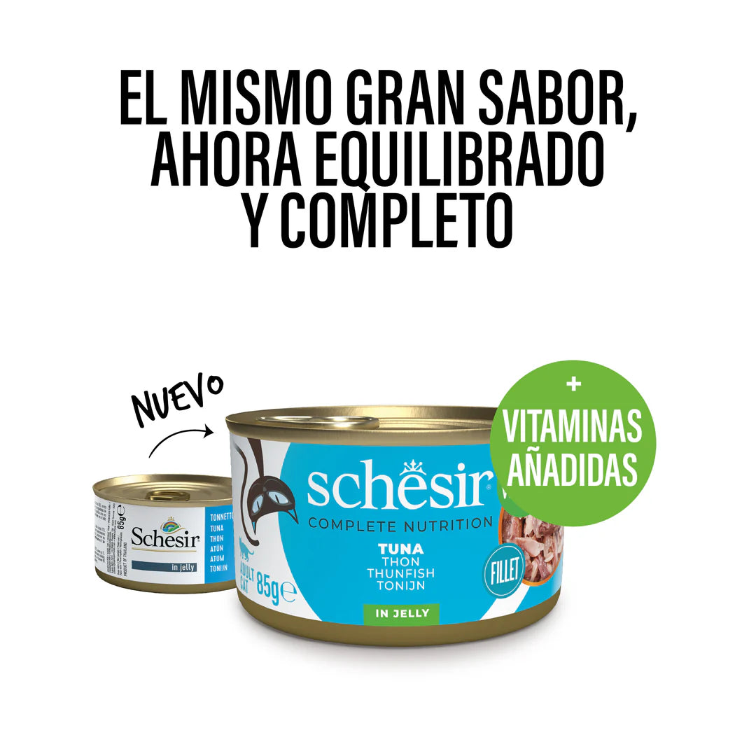 Con pocos ingredientes, sencillos y naturales, esta receta es alta en proteínas y baja en carbohidratos, lo que la convierte en una opción saludable y deliciosa para tu gato adulto. Además, su suave gelatina favorece una hidratación adicional, esencial para su bienestar diario. Schesir se compromete con la nutrición natural, asegurando que cada receta está formulada con las vitaminas, minerales y taurina necesarios para la vitalidad de tu gato, satisfaciendo incluso los paladares más exigentes.