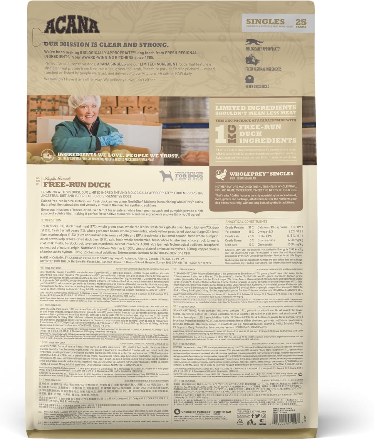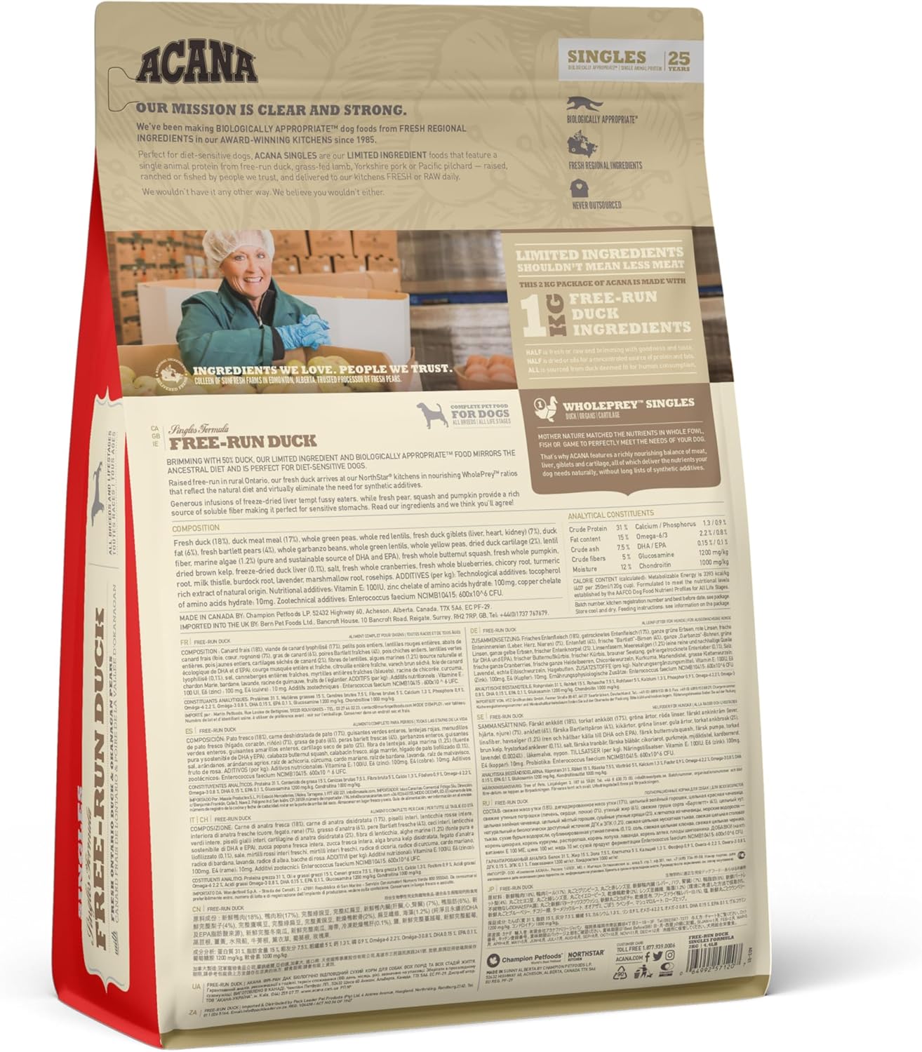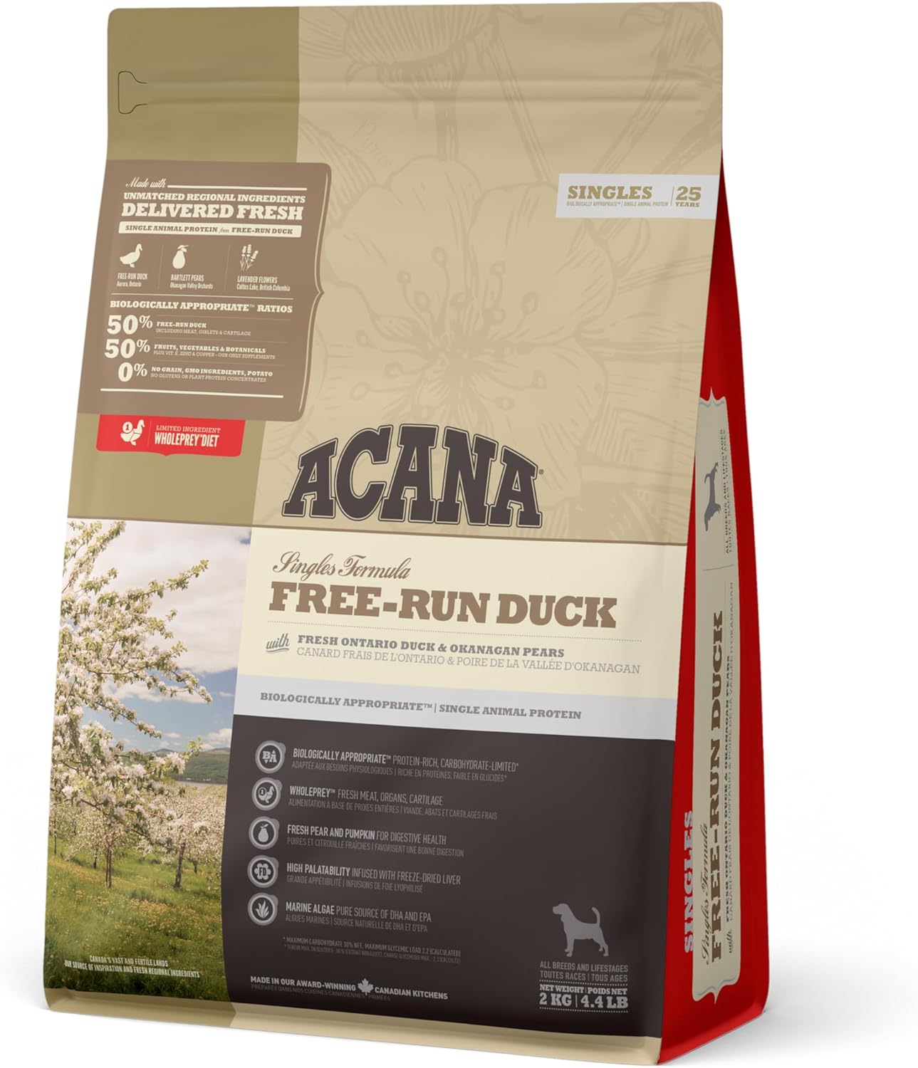 Elaborado con una única fuente animal (pato), proporcionando nutrición completa a perros con sensibilidad a alimentos o selectivos con la comida. Contiene un 50% de pato criado en libertad (carne, órganos y cartílago), la mitad crudos para aportar nutrientes en su forma más natural y la otra mitad deshidratados para una fuente concentrada de proteínas y sabor delicioso. Complementado con peras Bartlett enteras.
