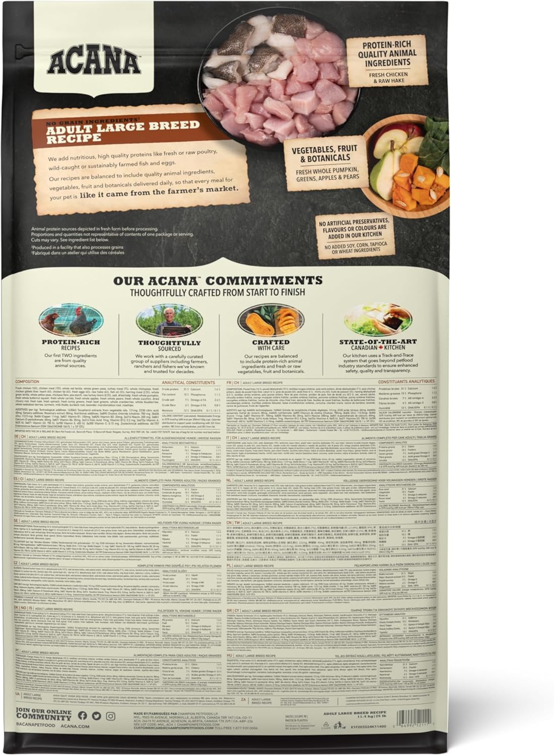 Los perros de raza grande tienen la misma anatomía que su antecesor el lobo gris, y, por tanto, tienen la misma necesidad biológica de una dieta rica y variada en ingredientes animales frescos y enteros. Debido a que el exceso de peso puede crear tensiones en los huesos y articulaciones, ACANA no contiene carbohidratos de rápida absorción como los de la tapioca o la patata, y proporciona gran cantidad de proteínas de gran calidad para mejorar la masa muscular y controlar la grasa corporal. ACANA Adult Large Breed está repleto de pollo de corral, platija salvaje y huevos frescos de corral, incluyendo carne, órganos, cartílago y hueso para proporcionarles todo lo que necesitan para gozar de una buena salud.