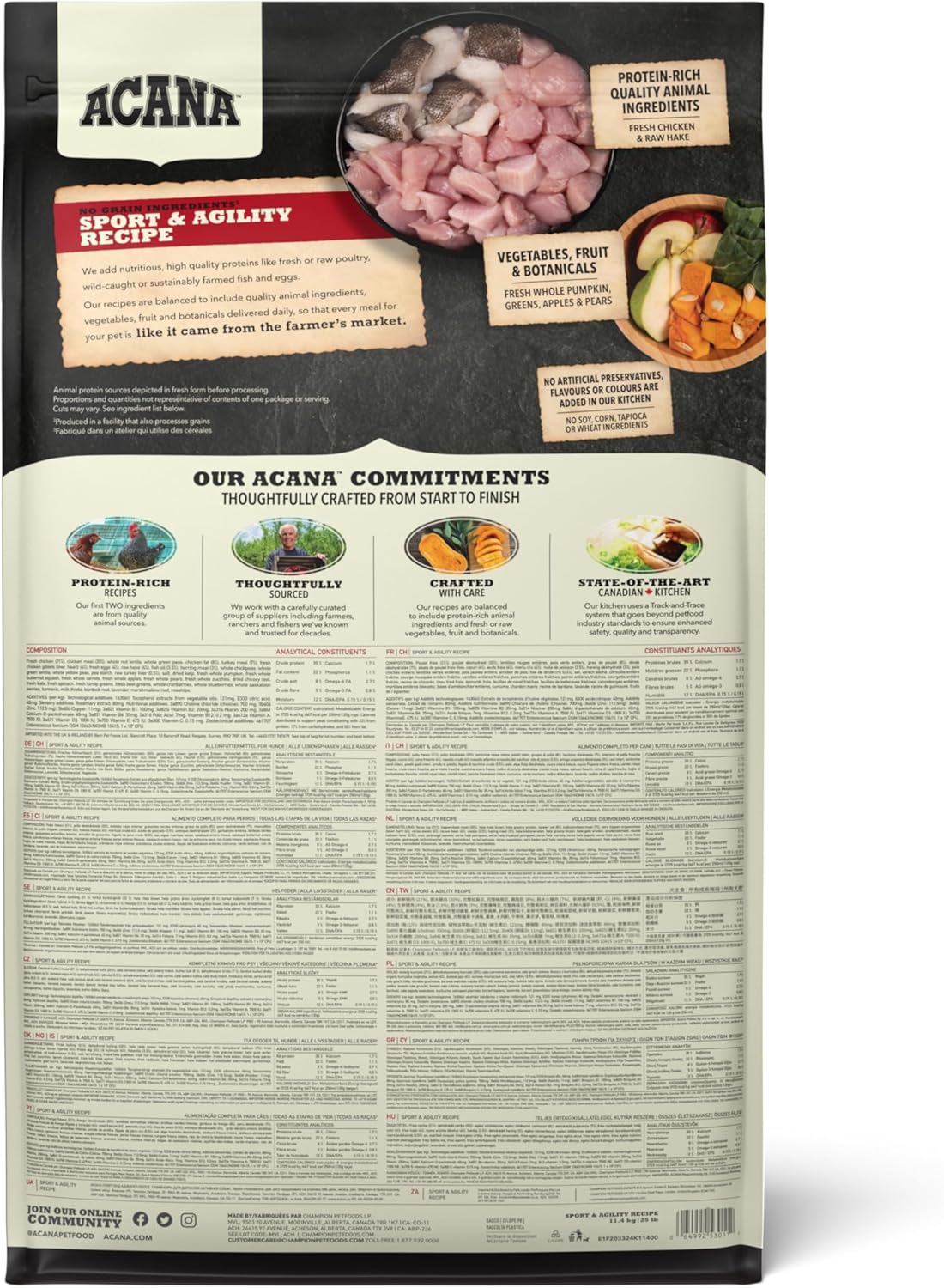 Los perros con mucha energía siempre están ocupados, ya sea corriendo en el parque, haciendo agility, canicross o ¡pastoreando ovejas! Por ello, ACANA Sport & Agility contiene un 35% de proteínas y grasas de origen animal, que proporcionan toda la energía y resistencia que los perros activos necesitan. Con pollo criado en libertad, platija salvaje y huevos frescos de corral, ACANA Sport & Agility les proporciona una nutrición completa libre de cereales y carbohidratos de rápida absorción.