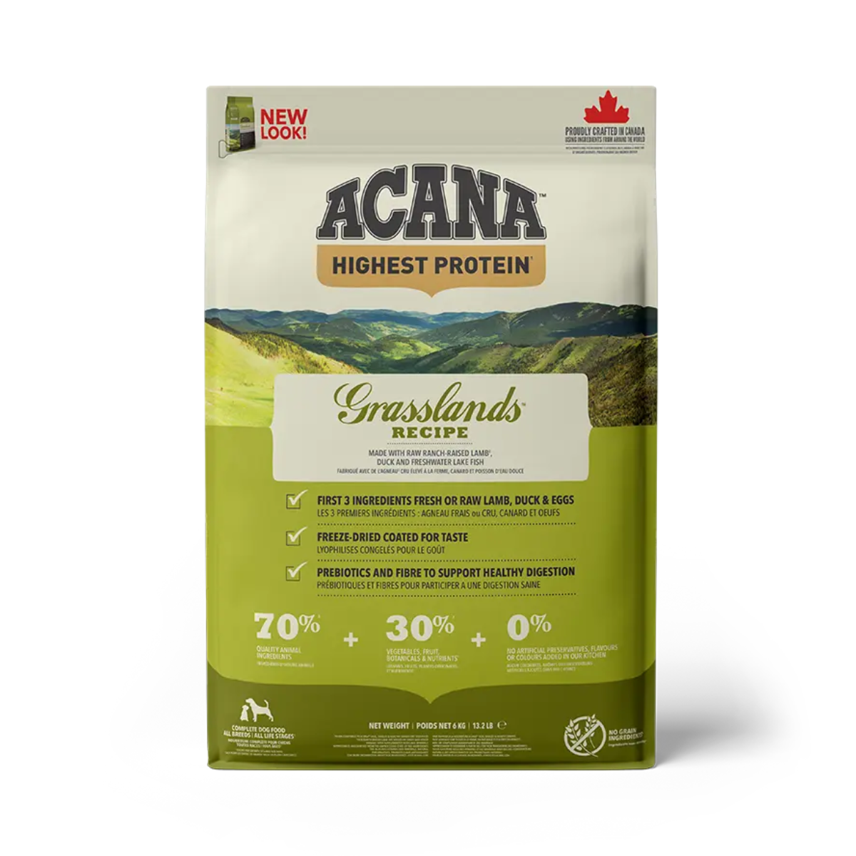 Acana Grasslands contiene cordero fresco alimentado en pasto, pato criado en libertad, huevos frescos de corral, pescado salvaje y pavo criado en libertad. Incluye carne, órganos y cartílago o hueso para nutrir a los perros de acuerdo a sus necesidades evolutivas y biológicas, dándoles todo lo que necesitan para mantenerse felices, sanos y fuertes. Sin cereales ni carbohidratos de rápida absorción como los del arroz, la tapioca o la patata, Acana Grasslands contribuye a mantener una salud óptima para perros de todas las razas y edades.