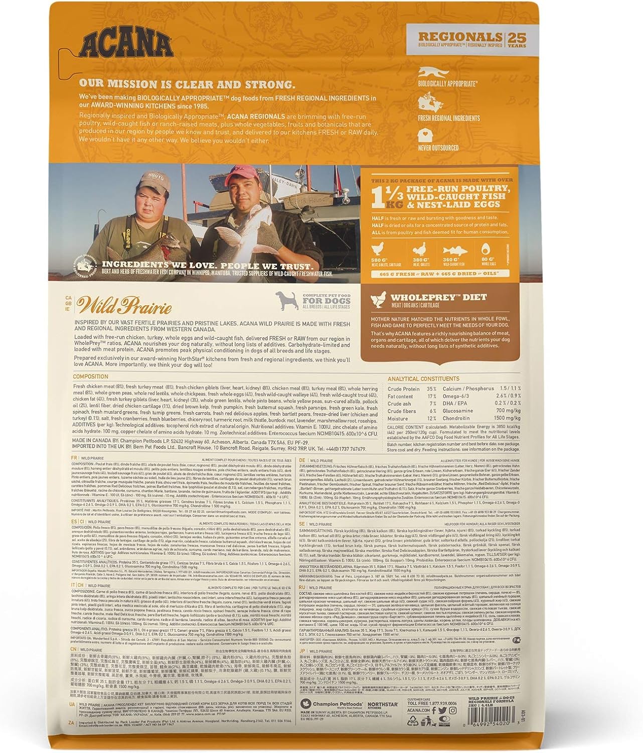 Repleto de pollo y pavo criados en libertad, huevos frescos de corral y pescado capturado en su entorno natural, ACANA Wild Prairie cuenta con un 70% de ingredientes animales de primera calidad, proporcionando todos los nutrientes, proteínas y vitaminas que los perros necesitan en su forma más natural y nutritiva. Sin cereales ni carbohidratos de rápida absorción como los del arroz, la tapioca o la patata, Acana Wild Prairie contribuye a mantener una salud óptima para perros de todas las razas y edades.