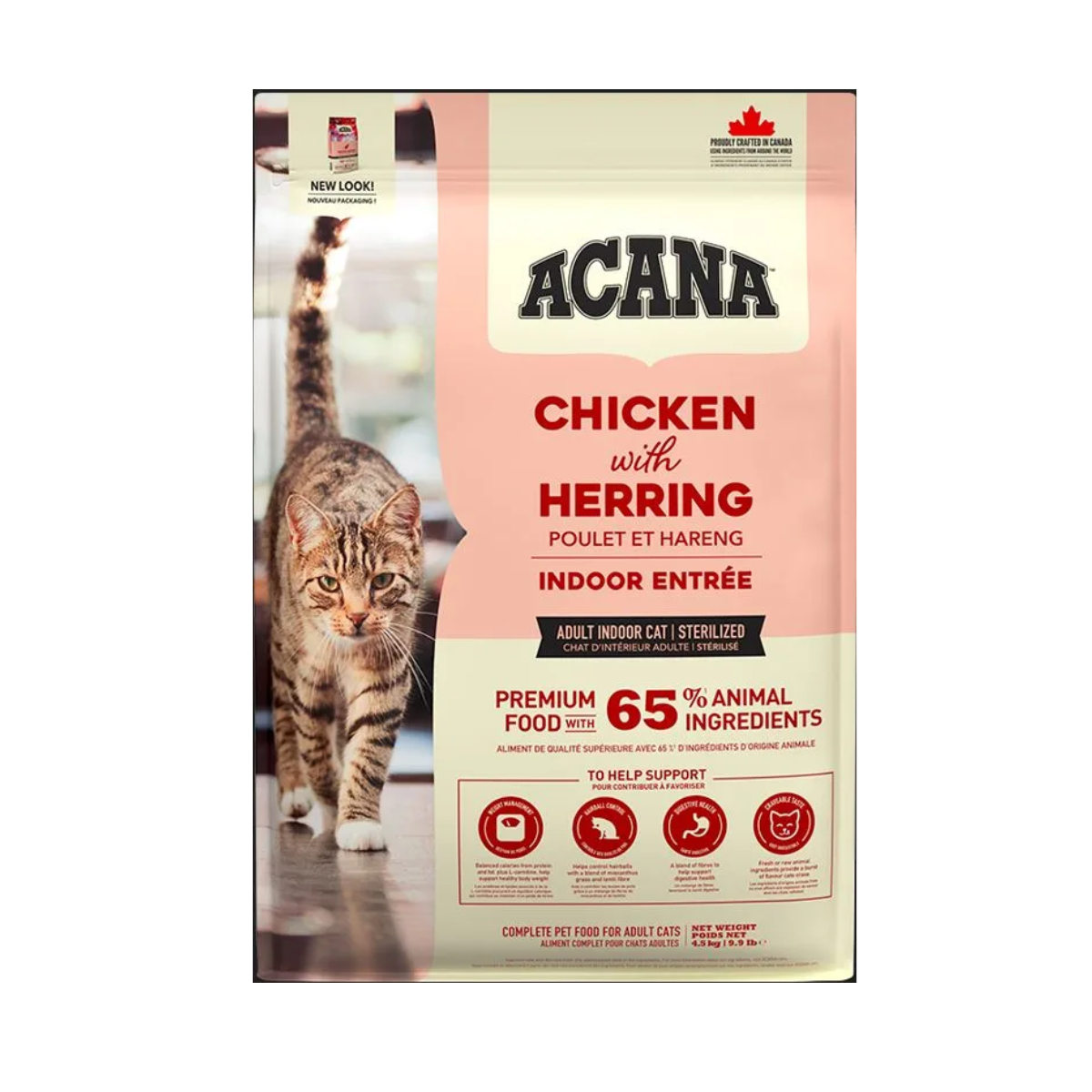 Especialmente formulado para gatos de interior que viven principalmente en casa y tienen un nivel de actividad más bajo. ACANA Indoor Entrée está elaborado con un 65% de carne de pollo, pavo y conejo, además incluye pescado como el arenque, cubriendo 4 tipos de proteínas distintas que fortalecen músculos y huesos. Esta comida completa para gatos contiene hierba miscanthus molida, que proporciona una fibra ecológica para reducir la densidad calórica en los alimentos, lo que ayuda a la pérdida de peso en las mascotas con falta de ejercicio físico. Controla las molestas bolas de pelo con una mezcla de proteínas de origen animal y fibras naturales, manteniendo su sistema digestivo en óptimas condiciones. Los ácidos grasos Omega-3 y Omega-6 equilibrados nutren su piel, proporcionando un pelaje brillante y saludable.