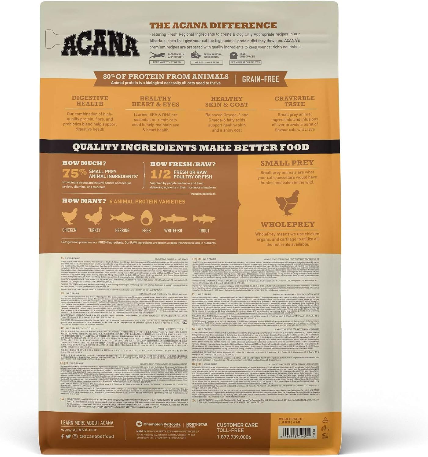 La anatomía de los gatos está diseñada para que coman una dieta rica en proteínas de origen animal. Inspirado por las amplias praderas y los prístinos lagos de Canadá, Acana Wild Prairie ofrece a tu gato ingredientes de calidad de origen animal de pollo y pavo, pescado de agua dulce y huevos. Rico en proteínas y lleno de nutrientes, incluye proporciones de presa entera de carne, órganos y huesos para que tu gato tenga una salud óptima, manteniéndolo feliz, sano y fuerte.