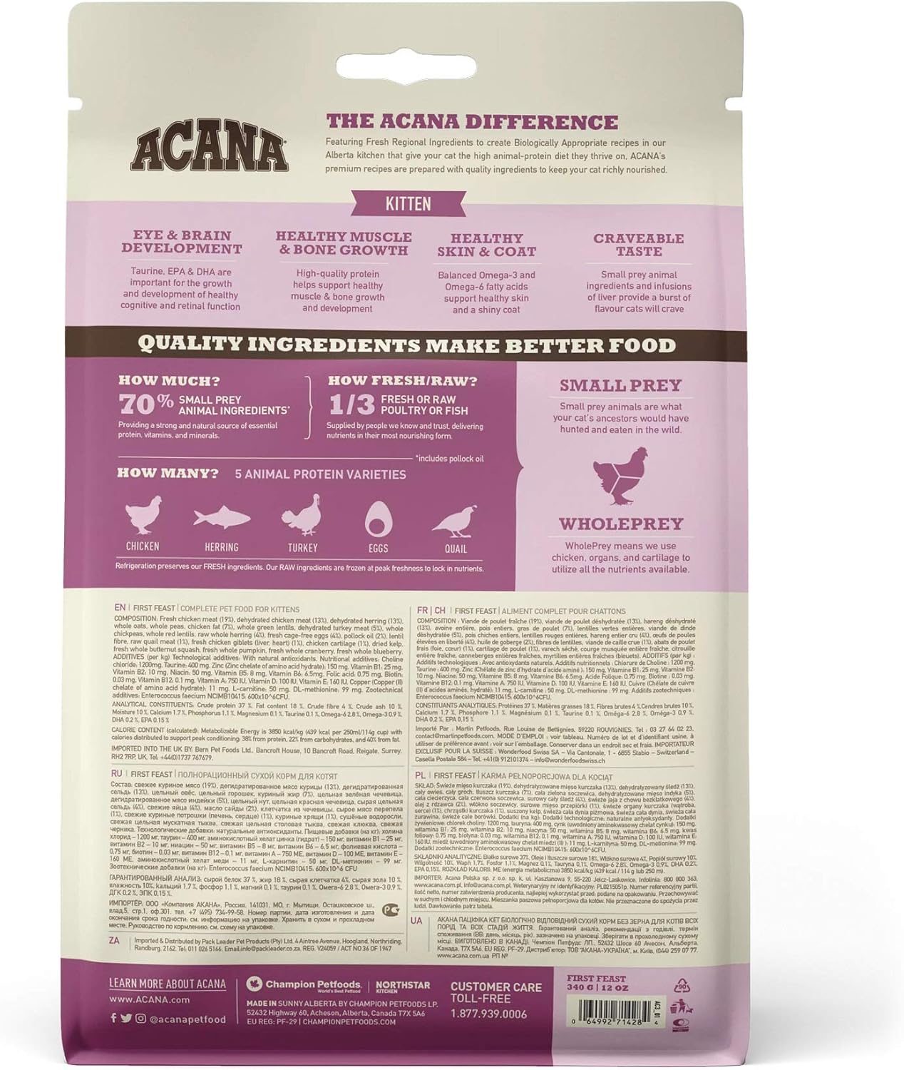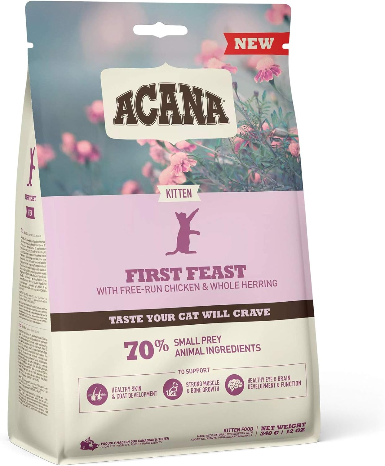 Elaborado para proporcionar todo lo que los gatitos necesitan para un correcto crecimiento y desarrollo, ACANA First Feast está repleto de pollo de corral y arenque entero, incluyendo carne, órganos, cartílago y hueso. Con un 75% de proteína animal de primera calidad y 1/3 de ingredientes animales frescos o crudos, ofrece todos los beneficios de una dieta completa conservando todo el sabor de la mejor materia prima.