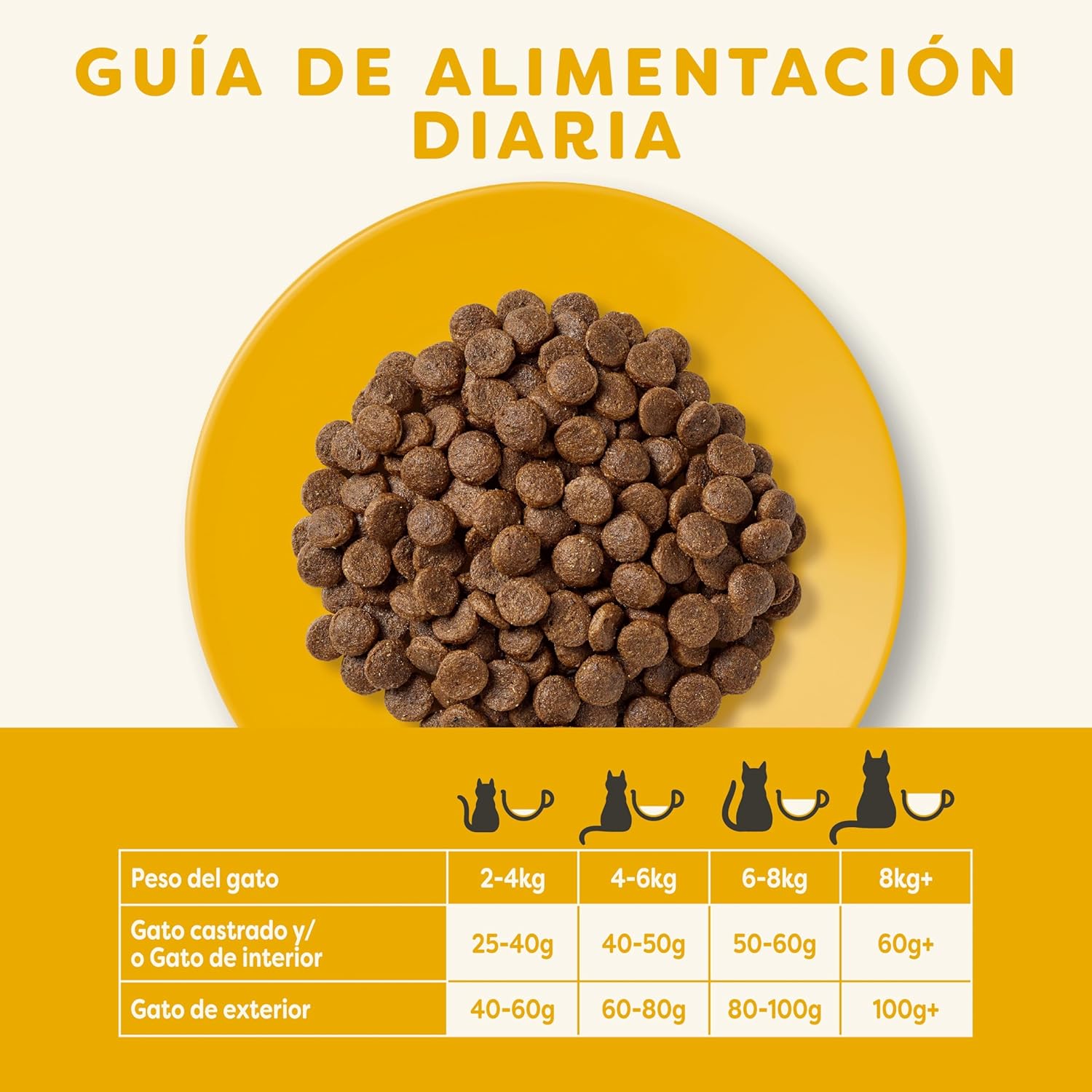 Guía de alimentación: Para un cambio de alimentación se recomienda hacer transición gradual de un alimento a otro ,durante al menos 10 días. La ración diaria recomendada es orientativa ya que se debe tener en cuenta si se ofrece alimento húmedo al gato, en este caso la ración diaria de pienso seco debe reducirse para evitar la sobrealimentación y futuros ,problemas de peso. El gato debe disponer siempre de agua limpia y fresca. Almacenar en un lugar seco.
