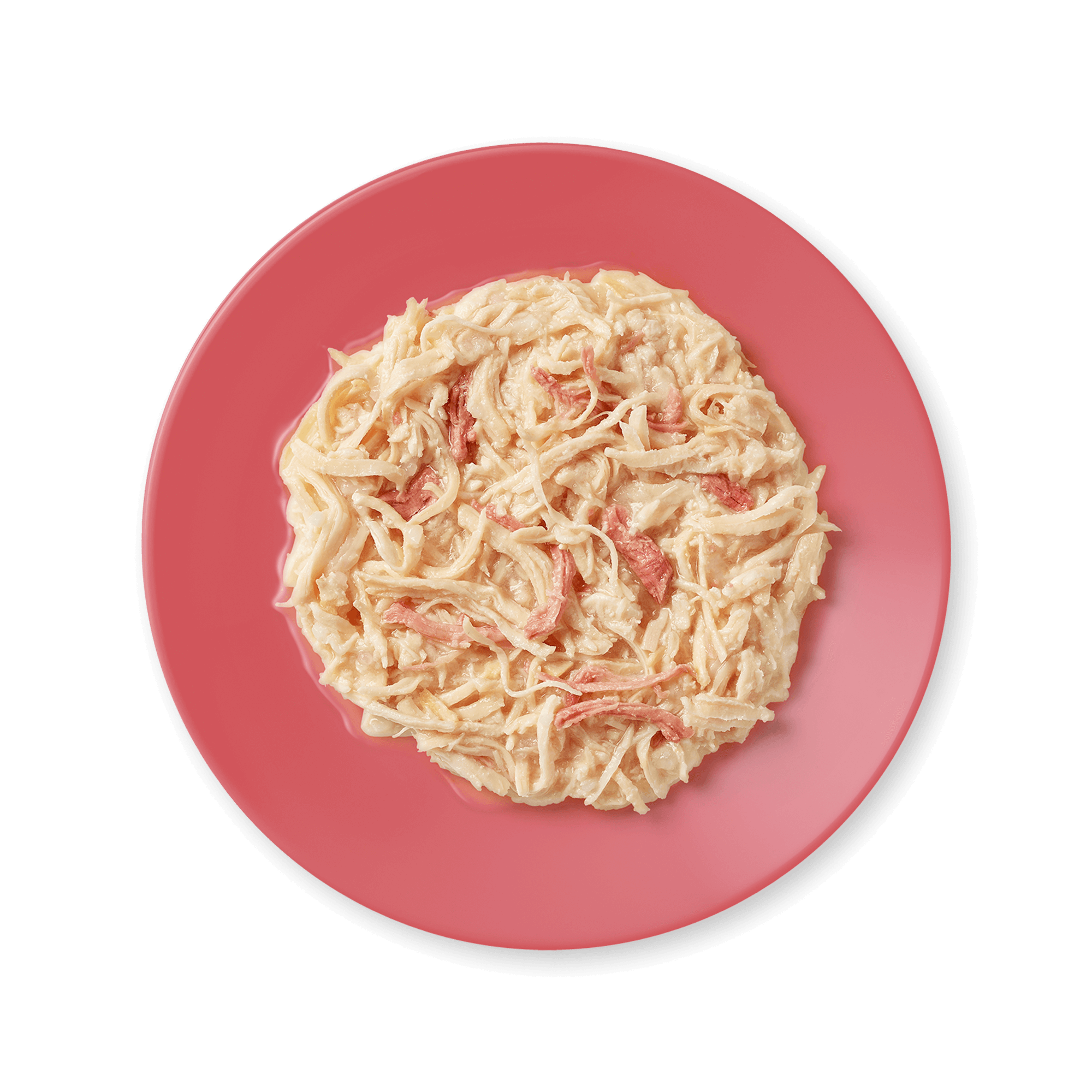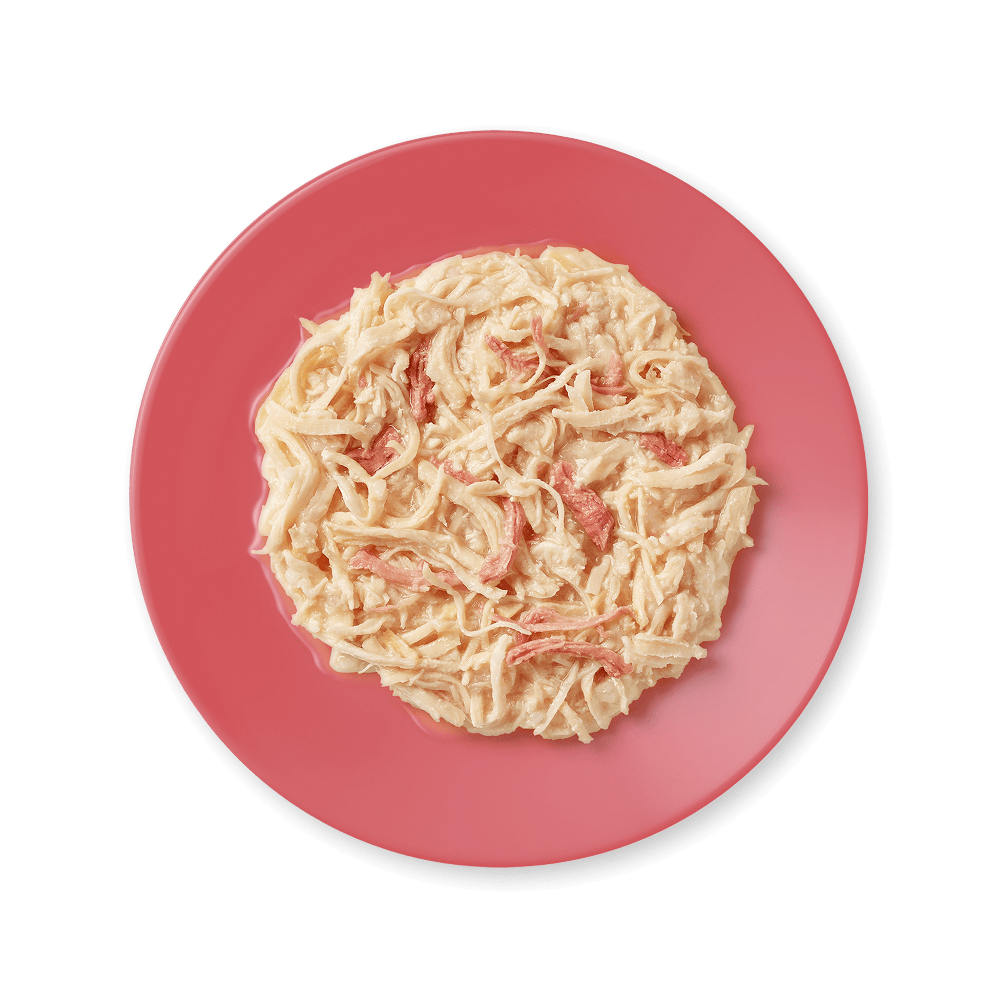 Textura irresistible en caldo natural: Las tiernas hebras de pechuga de pollo se complementan perfectamente con el sabor distintivo del pato, todo envuelto en un delicioso caldo que los gatos encuentran absolutamente irresistible.