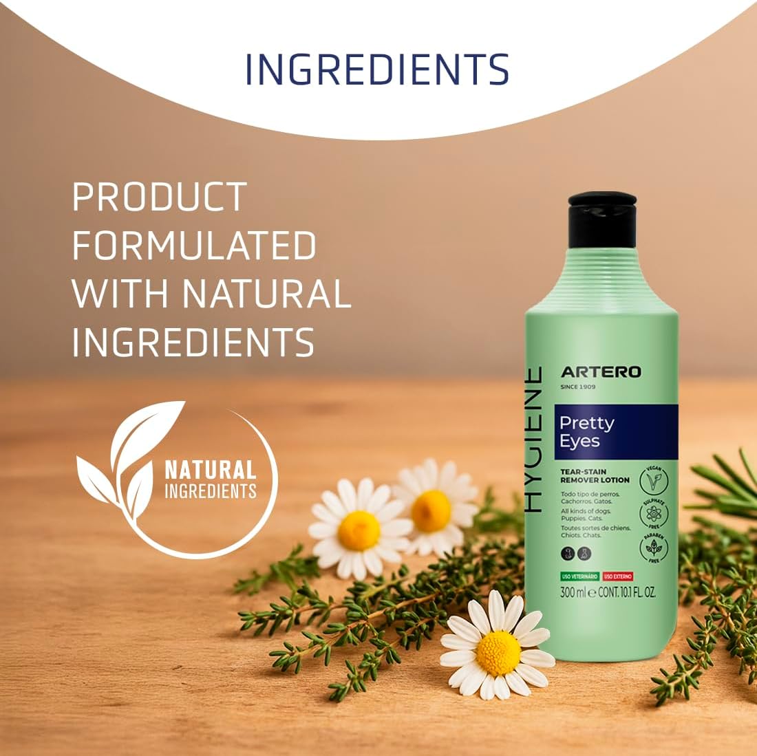Solución natural especializada para eliminar las antiestéticas manchas marrones del lagrimal en perros y gatos. Con ingredientes 100% naturales: extracto de romero, manzanilla y tomillo que proporcionan propiedades calmantes, antisépticas y antimicrobianas. Regula el pH y elimina las bacterias causantes del oscurecimiento del pelaje alrededor de los ojos.