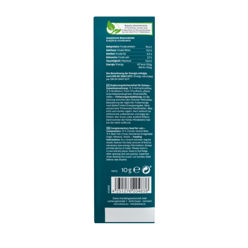 Un delicioso snack suave y jugoso, con una capa de pollo que envuelve un relleno cremoso de carne de res. Cada bocado es una explosión de sabor que hará ronronear de felicidad a tu gato. Perfecto para premiar a tu felino con una experiencia sabrosa y satisfactoria.
