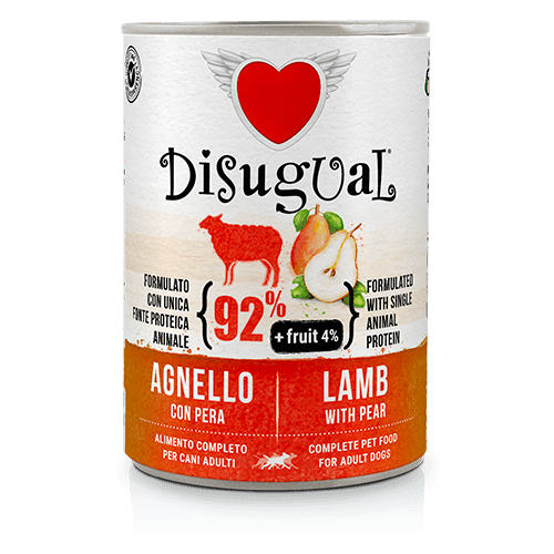 Disugual +Fruta es un alimento húmedo completo y equilibrado para perros adultos, elaborado con cordero como única fuente de proteína animal y enriquecido con pera para un toque extra de dulzura. Cada lata contiene un 92% de carne de cordero y un 4% de pera, lo que hace que esta fórmula sea ideal para perros con paladares exigentes.