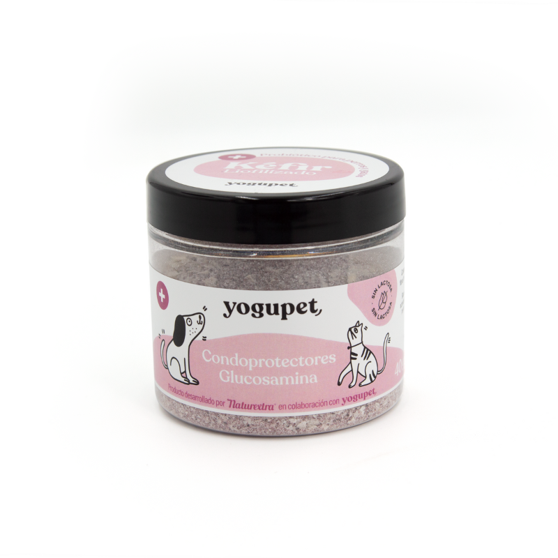 Ayuda a mantener las articulaciones de tus mascotas fuertes y flexibles con YOGUPET Kéfir Liofilizado con Condroprotectores y Glucosamina. Este alimento complementario es una solución pensada para el bienestar articular de perros y gatos de todas las edades y razas. Combina kéfir de leche de vaca sin lactosa liofilizado con el toque antioxidante de los arándanos, y lo más importante, con condroprotectores y glucosamina, ingredientes clave para la salud articular.